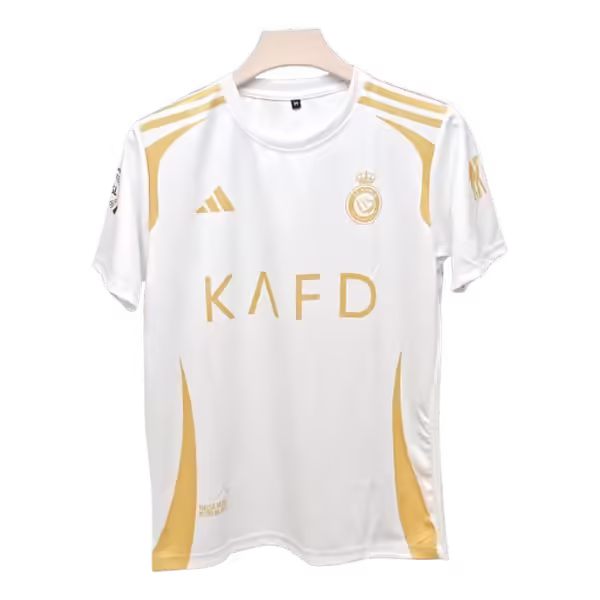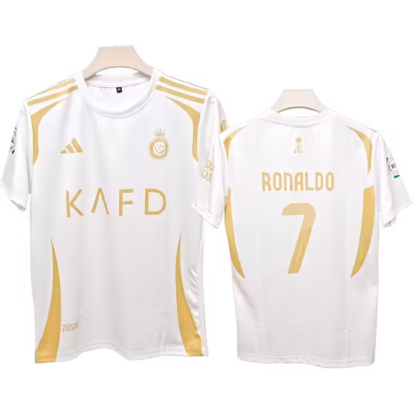 Design: The Al Nassr 2024-25 C. Ronaldo third Jersey boasts a stylish and contemporary design that pays homage to the club’s rich history and tradition while incorporating modern elements to reflect the team’s forward-looking nature. The jersey features the club’s signature primary color, vibrant white and gold accents.