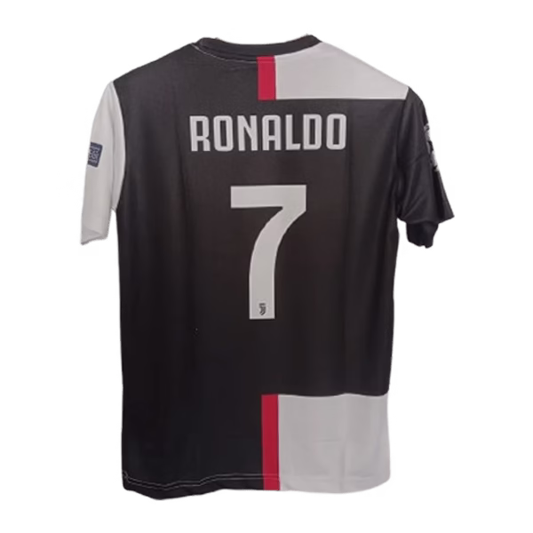 Primary Color: The jersey color is black with white and red accents, complemented by the Adidas logo, the Juventus logo, and Ronaldo’s number 7.