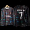 Primary Color: The jersey color is black with blue and white accents, complemented by the Nike swoosh, the Portugal crest, and Ronaldo’s number 7.