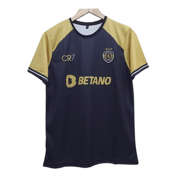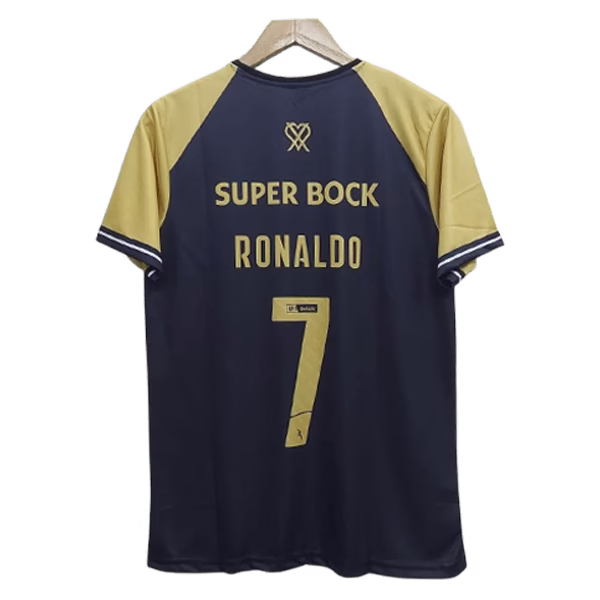 The jersey celebrates Cristiano Ronaldo’s connection with Sporting CP. It includes a cr7 crest on the front, which recognizes his contributions and achievements during his time at the club.