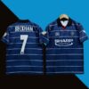 This striking jersey features a bold navy blue base with thin white horizontal pinstripes, a style that perfectly reflects United’s dominance in the era.