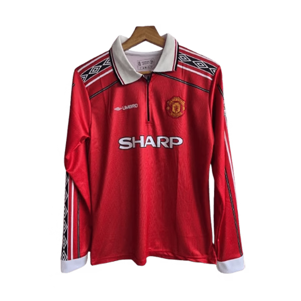 The Jersey features Manchester United’s classic red, reflecting the late 90s traditional design. It includes a distinctive back white collar and a button-up neckline.