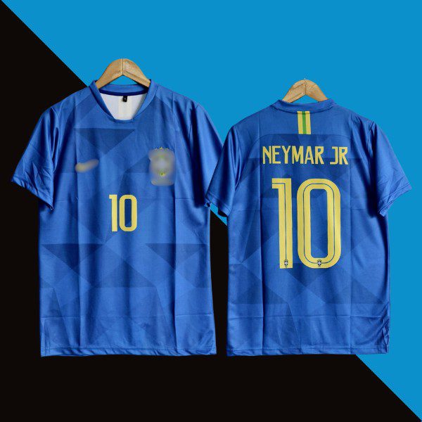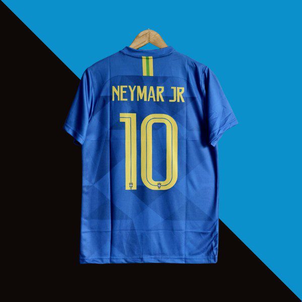 The Brazil 2018-19 away jersey – Neymar Jr. edition is made for fans who love flair, speed, and pure football energy. featuring the classic blue away color, geometric pattern detailing, and Neymar Jr. No.10 on the back.