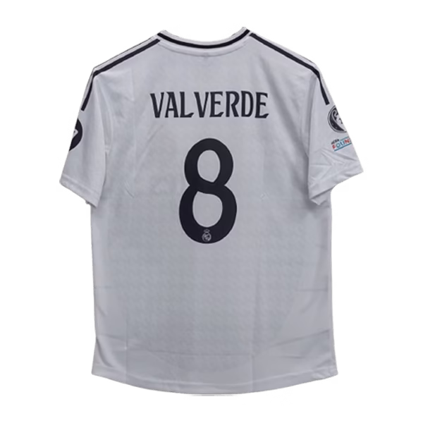 The Real Madrid 2024-25 Valverde home jersey is an emblem of the club’s storied tradition and its exciting future, represented by dynamic midfielder Federico Valverde.