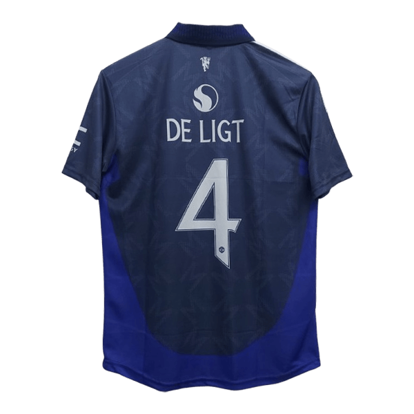 Primary Color:  The Jersey features Manchester United’s traditional away colors blue, enhanced with modern design elements. The front is adorned with subtle, darker red accents, adding depth and a contemporary look.