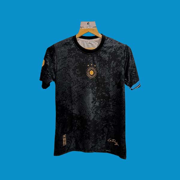 This jersey features a unique pattern that combines black and gold colors with intricate details, creating a stunning and modern look.