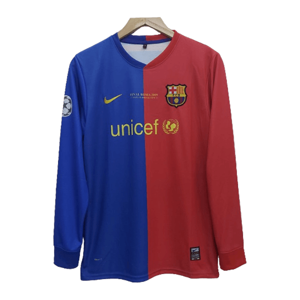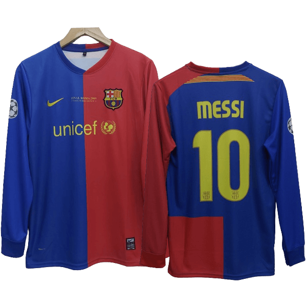 The FC Barcelona 2008-09 Lionel Messi UCL final long-sleeve jersey is a timeless piece of football history, commemorating the club’s victory in the UEFA Champions League final. The legendary Lionel Messi wore them.