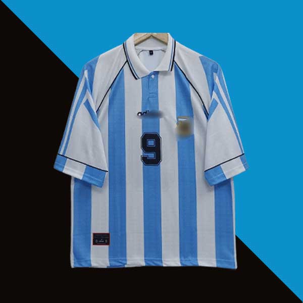 This retro jersey captures Argentine football’s bold spirit, featuring the traditional sky blue and white strips.