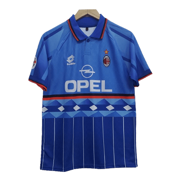 The jersey features a unique and distinctive design that reflects the late 90s aesthetic. The dominant color is a striking blue, capturing the spirit of AC Milan’s Fourth kit during that era.