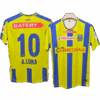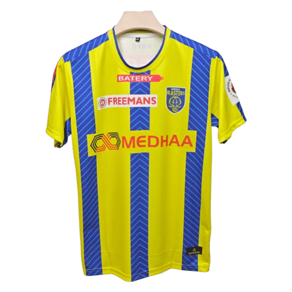 Design: The Away Jersey boasts a sleek and modern design that beautifully blends tradition with innovation. The jersey’s primary color is a deep and vibrant yellow, reminiscent of the team’s rich history and the breathtaking landscapes of Kerala. The design is further accentuated by subtle patterns inspired by local art and culture, making it a unique and eye-catching piece for both fans and fashion enthusiasts.